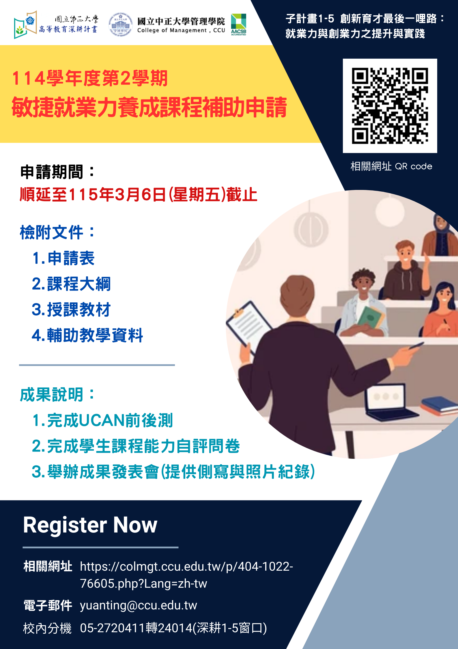 【深耕計畫1-5補助教師開授敏捷就業力養成課程】114學年度第2學期申請期間順延至115/3/6(五)截止,歡迎各系教師踴躍提出申請。